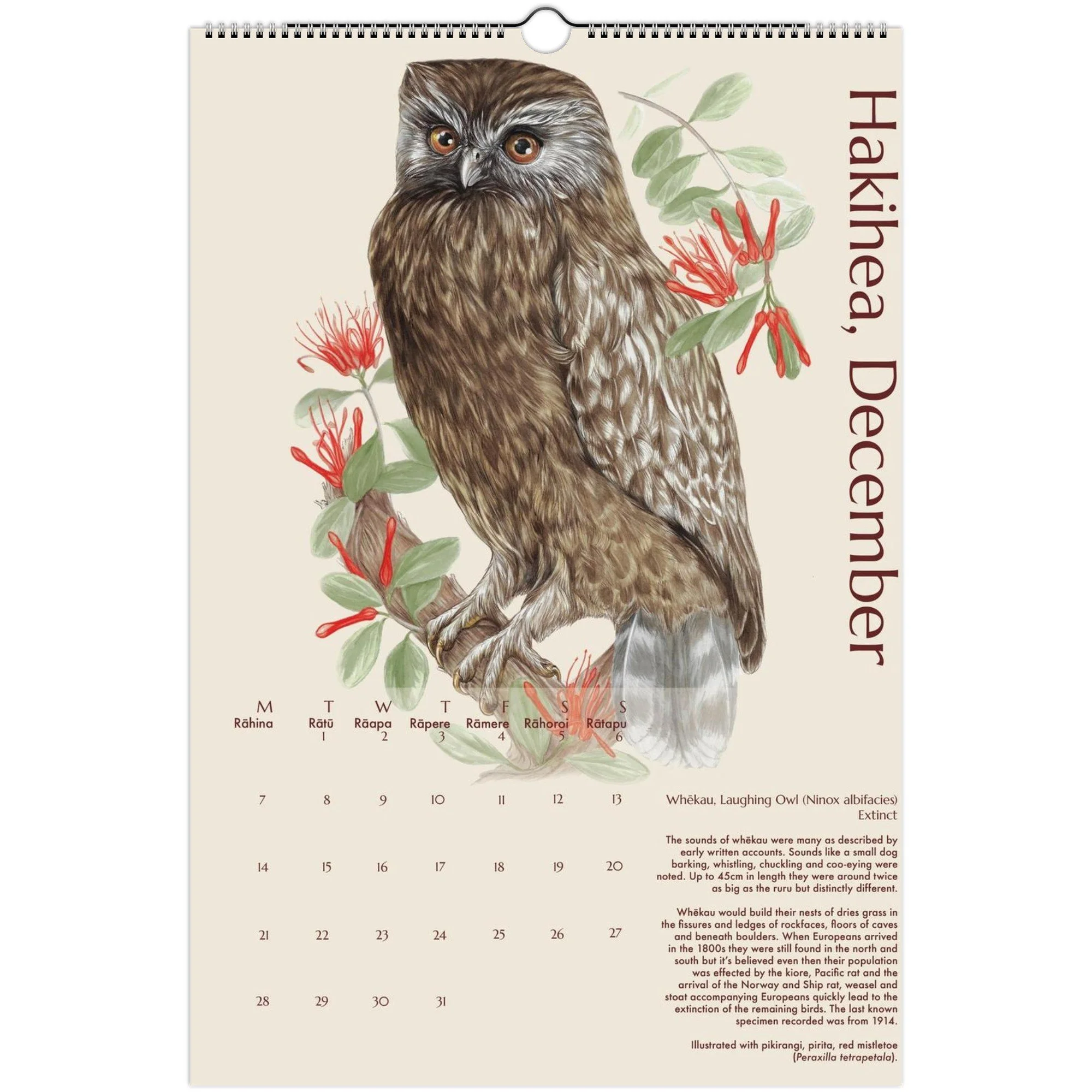 This years version is A3 spiral bound and focuses on manu māori, native bird species. Learn a little each month about the conservation status and behaviours of these special animals. Hand painted illustrations and text by Erin Forsyth.